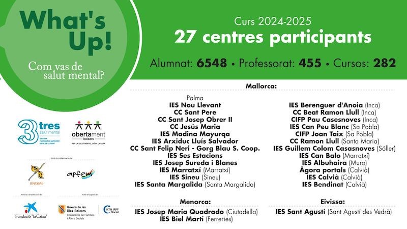 Veintisiete centros de Secundaria de Baleares, 6.548 alumnos/as y 455 docentes han participado este curso 2024-2025 en el “What’s Up! ¿Cómo vas de salud mental?”, un proyecto de sensibilización en salud mental dentro del ámbito educativo que en las Islas Baleares desarrolla 3 Salut Mental a través del programa Obertament Balears con el apoyo de la Fundación “la Caixa”. Además, Obertament Balears cuenta con la financiación de la consejería de Familias, Bienestar Social y Atención a la Dependencia del Govern de les Illes Balears a cargo del 0,7% del IRPF.